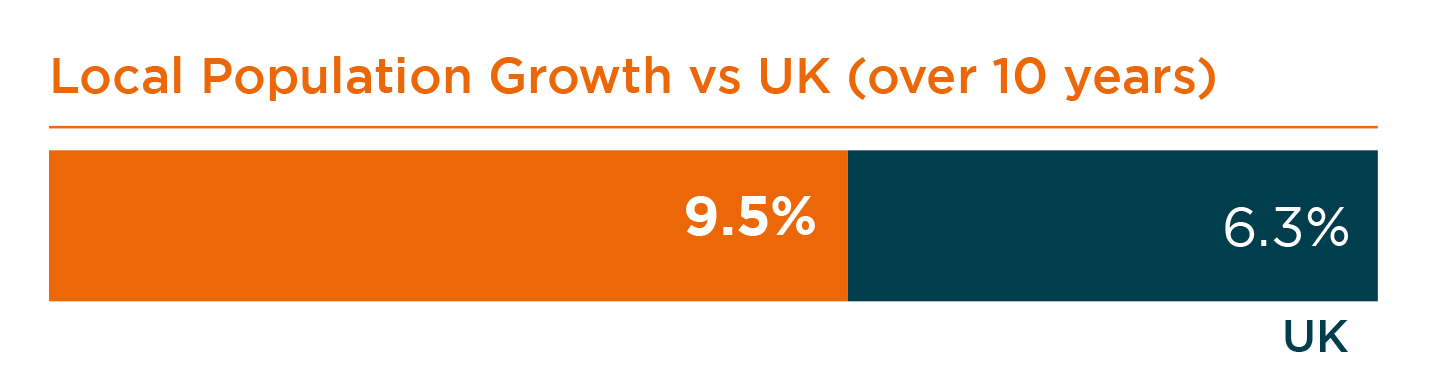Buckinghamshire demonstrates strong demographic and economic performance compared to UK averages. Over the last 10 years the county has benefited from higher population growth (9.5%) than the UK as a whole (6.3%), with 341,000 (62% of the population) of working age. Additionally, 84.0% of Buckinghamshire’s working-age population is economically active, higher than the UK average of 79.0%.